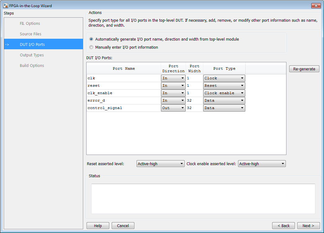 Просмотрите список портов. Мастер FIL анализирует модуль HDL верхнего уровня для получения всех портов ввода/вывода и отображения их в таблице портов ввода/вывода DUT. Синтаксический анализатор пытается определить типы портов из имен портов. Затем мастер отображает эти сигналы в разделе Port Type.