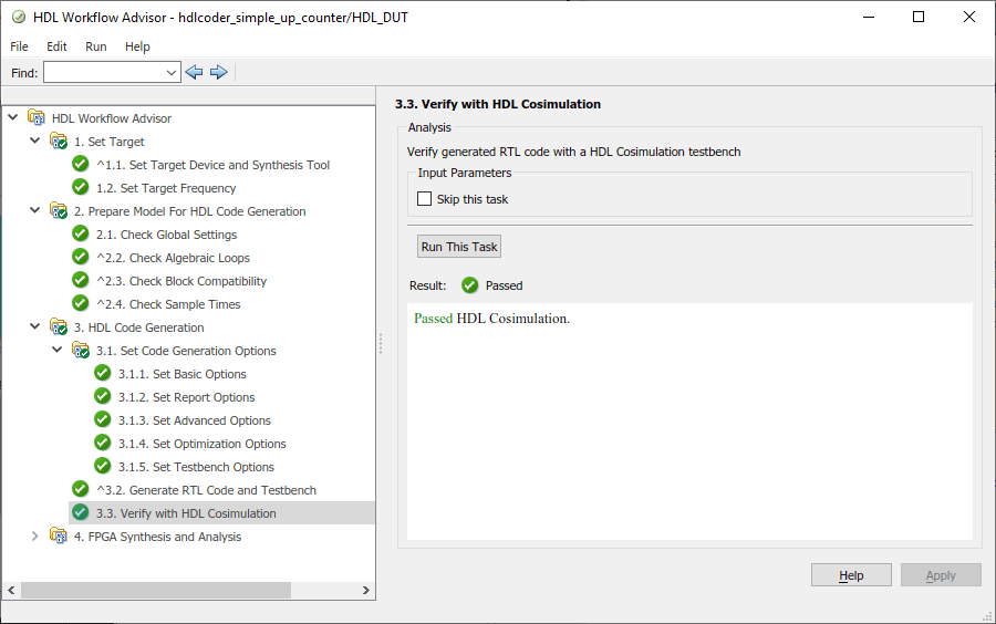 На шаге 3.3 нажмите кнопку Run This Task. Консультант по рабочим процессам ЛПВП и ЛПВП Verifier™ проверить сгенерированный ЛПВП с помощью косимуляции между имитатором ЛПВП и испытательным стендом Simulink. Все релевантные сообщения о состоянии отображаются в окне состояния помощника по рабочим процессам HDL.