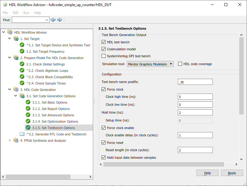 На шаге 3.1.5 Задайте параметры тестирования (Set Testbench Options) выберите Модель косимуляции (Cosimulation model). Затем установите для инструмента «Моделирование» значение Mentor Graphics ModelSim или Cadence Incisive для вашего имитатора ЛПВП.