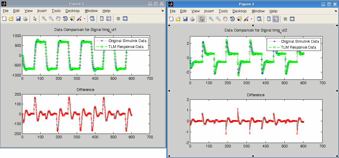 HDL Verifier™ может генерировать конструкцию Simulink, которая включает непрерывные временные сигналы. Когда симуляция Simulink и захваченный вектор воспроизводятся в SystemC, они могут не дать точно таких же результатов. График разности показывает по существу ту же кривую с числовыми разностями, которые более выражены при переходах сигнала, как показано в следующих окнах рисунка MATLAB.