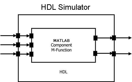 Функции компонента MATLAB моделируют поведение компонентов в модели HDL. Модуль-заглушка (предоставляющий только определения портов) в модели HDL передает свои входные сигналы в функцию компонента MATLAB. Компонент MATLAB обрабатывает эти данные и возвращает результаты на выходы модуля-заглушки. Компонент MATLAB обычно обеспечивает некоторые функциональные возможности (например, фильтр), которые еще не реализованы в коде HDL.