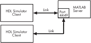 При связывании с MATLAB имитатор HDL функционирует как клиент, а MATLAB - как сервер. На следующем рисунке показан сценарий подключения нескольких клиентов к серверу через порт сокета TCP/IP 4449.