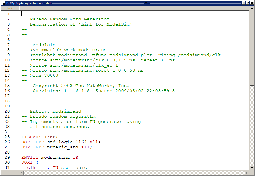 После настройки библиотеки конструкций обычно для создания и изменения кода HDL используется редактор ModelSim Editor. Для этого учебного пособия нет необходимости создавать код VHDL самостоятельно. Вместо этого откройте и проверьте существующий файл modsimrand.vhd. В этом разделе освещаются области кода в modsimrand.vhd которые представляют интерес для испытательного стенда ModelSim и MATLAB.