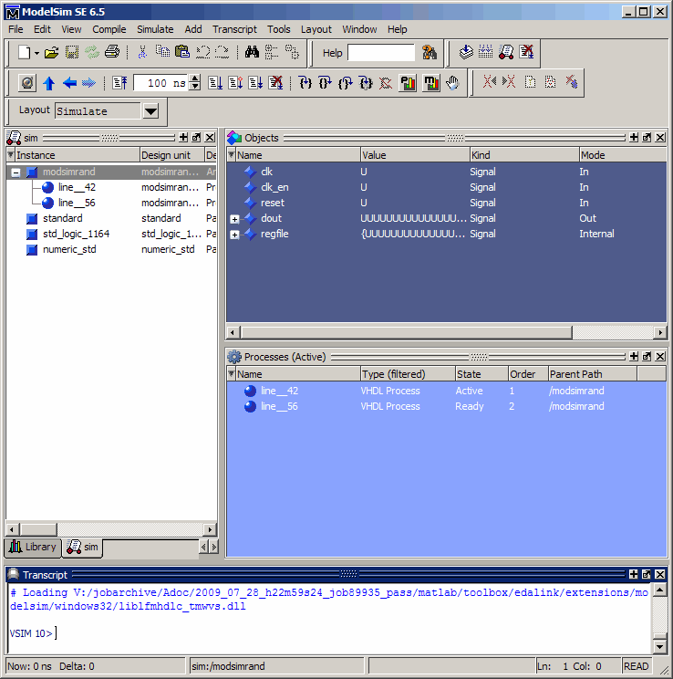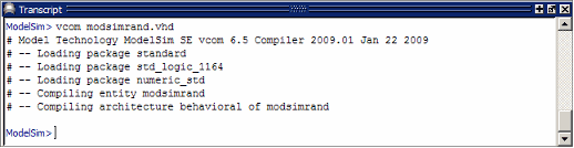 После компиляции исходного файла VHDL можно загрузить модель для моделирования. В этом разделе объясняется, как загрузить экземпляр сущности modsimrand для моделирования:
