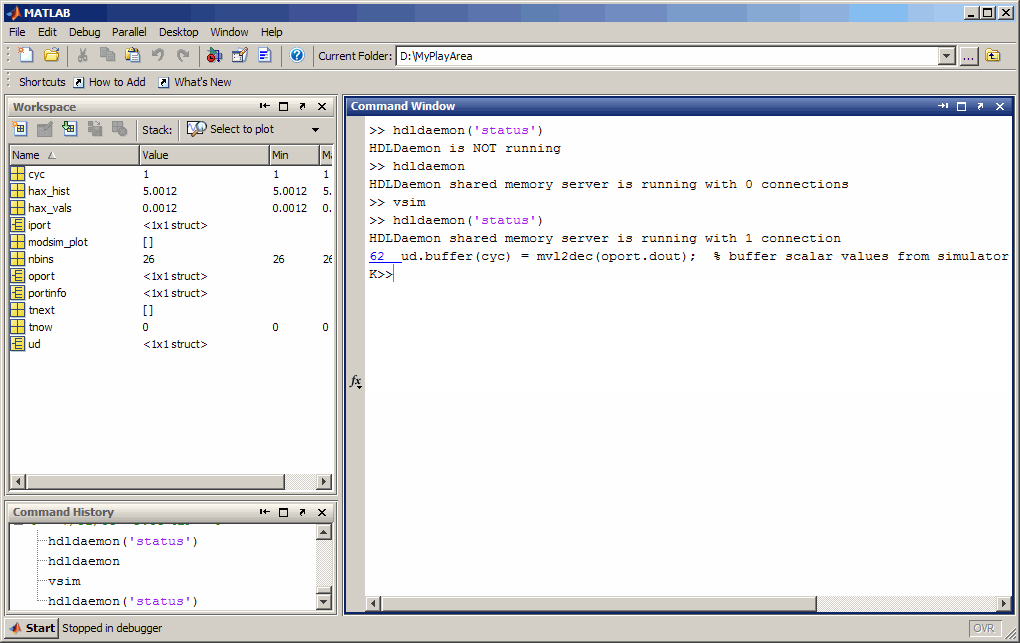 ModelSim теперь заблокирован и остается заблокированным до явной разблокировки. Если моделирование заблокировано, обратите внимание, что MATLAB отображает данные, переданные ModelSim функции MATLAB в окне Рабочая область (Workspace).