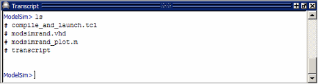 Команда должна содержать список файлов modsimrand.vhd, modsimrand_plot.m, transcript, и compile_and_launch.tcl.