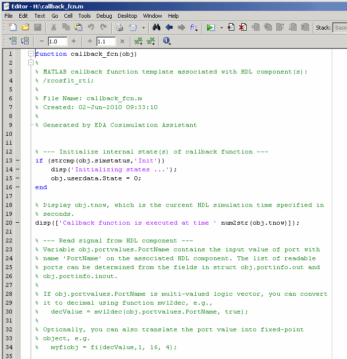 Помимо запуска имитатора HDL, программное обеспечение HDL Verifier открывает редактор MATLAB и загружает callback_fcn.m (показано частичное изображение).