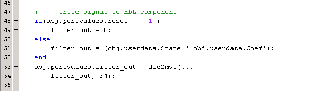Входной сигнал «сброс» управляет выходом фильтра. Если сброс низкий, то выход является произведением предыдущих входов и коэффициентов фильтра. MATLAB преобразует десятичный результат в многозначный логический выход компонента HDL.