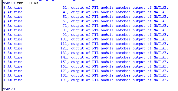Эти сообщения указывают, что выходные данные компонента HDL соответствуют поведенческим выводам компонента MATLAB.