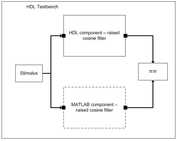 Стенд тестирования HDL создает экземпляры двух компонентов фильтра с увеличенным косинусом: один реализован в HDL, а другой связан с функцией обратного вызова MATLAB. Испытательный стенд также генерирует стимул для обоих фильтров и сравнивает их выходные сигналы.