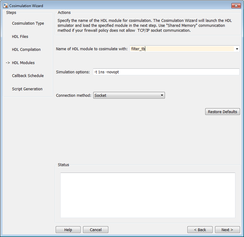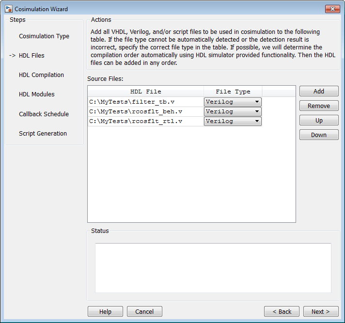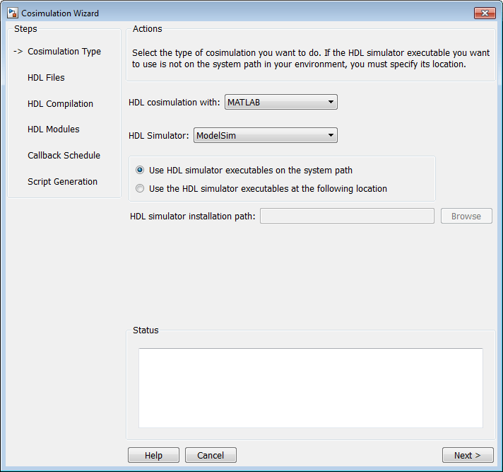Если исполняемые файлы не отображаются в пути, укажите путь к имитатору HDL, как описано в разделе Тип косимуляции - функция MATLAB.