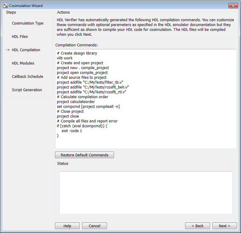 Мастера косимуляции (Cosimulation Wizards) перечисляют команды по умолчанию в окне Команды компиляции (Compilation Commands). Изменять эти значения по умолчанию для данного учебного пособия не требуется.