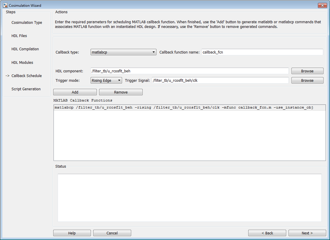 Нажмите кнопку Add. Мастер косимуляции создает соответствующее matlabcp команда, связывающая u_rcosflt_beh модуля HDL с функциональным callback_fcn MATLAB, как показано на следующем рисунке: