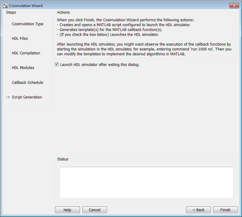 Нажмите кнопку Готово (Finish), чтобы завершить сеанс мастера косимуляции и создать сценарии.