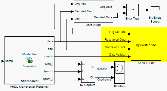 Откройте записываемую копию модели манчестерского приемника. На вкладке Моделирование (Simulation) в разделе Файл (File) щелкните Открыть (Open). Выберите файл manchestermodel и нажмите «Открыть». Модель Simulink должна выглядеть следующим образом. Блок Cosimulation HDL помечен как «VHDL Manchester Receiver».