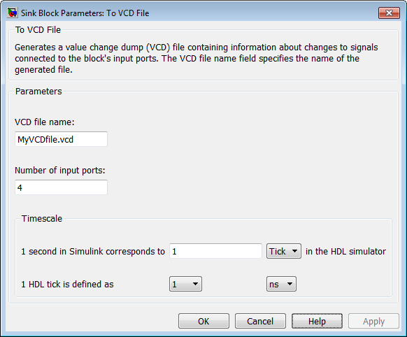 Замените блок Signal Scope блоком To VCD File следующим образом: