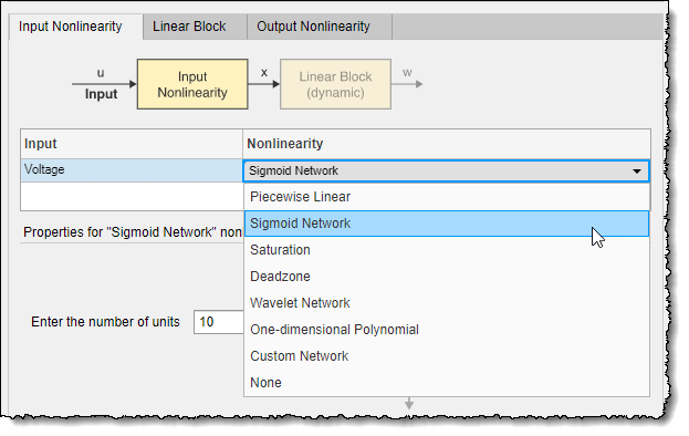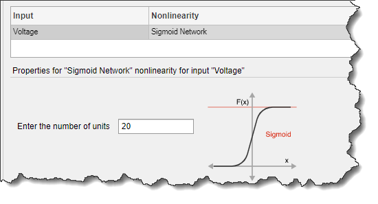 Щелкните ячейку Нелинейность (Nonlinearity) для Voltage переменная и выберите Sigmoid Network из списка.