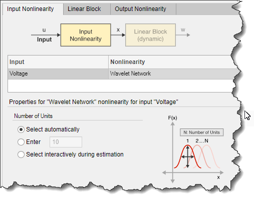 Для Voltage ввод, установите нелинейность в значение Wavelet Network. Значение по умолчанию для параметра Количество единиц измерения (Number of Units) - Выбрать автоматически (Select Automatically).