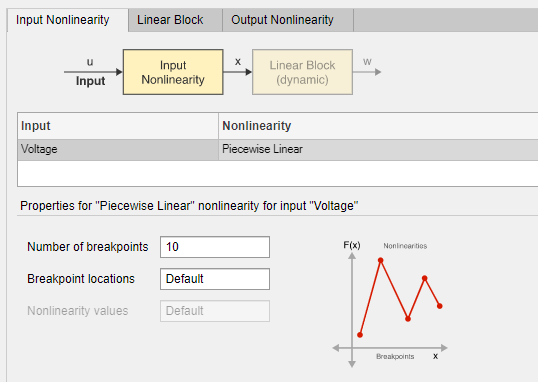 Выберите вкладку Input Nonlinearity (Нелинейность ввода). Нелинейность по умолчанию - это функция Кусочно-линейная с 10 точками останова.