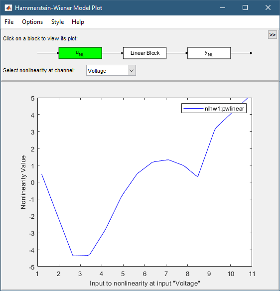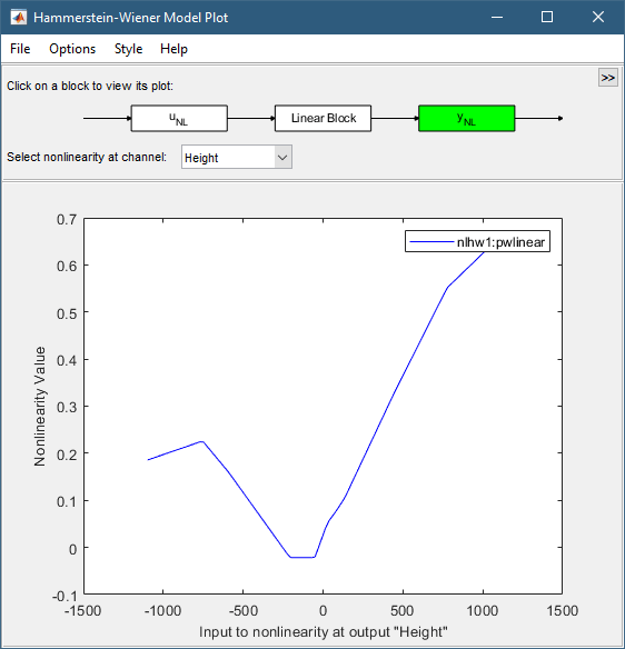 Щелкните прямоугольник yNL в верхней части окна графика модели Hammerstein-Wiener.