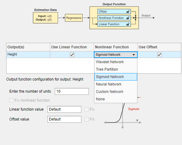 Здесь f (.) - статическая нелинейная функция, отображающая регрессоры на выход. Чтобы выбрать f (.) и связанные с ним параметры, используйте закладку Функция вывода.