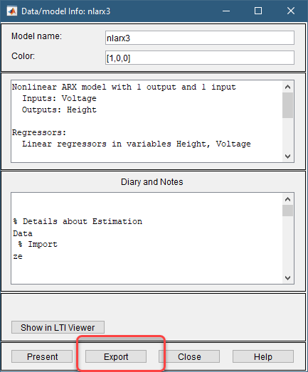 Перетащите элемент nlarx3 в поле Кому в рабочую область (To Workspace) в главном окне приложения Идентификация системы (System Identification). Либо дважды щелкните значок nlarx3 для открытия информационной доски. Затем щелкните Экспорт (Export), чтобы экспортировать модель в основное рабочее пространство.