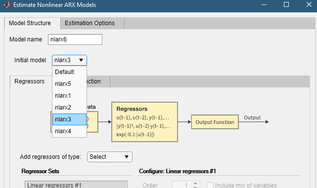 Выбрать nlarx3 из начальной модели. При этом свойства, отображаемые на вкладках Регрессоры (Regressors) и Функция вывода (Output Function), устанавливаются в значения, соответствующие nlarx3.