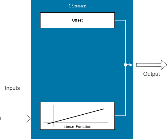 A linear объект реализует аффинную функцию и является функцией отображения для оценки нелинейных моделей ARX. Функция отображения использует комбинацию линейных весов и смещения. В отличие от других объектов отображения для нелинейных моделей, linear объект не содержит размещений для нелинейного компонента.