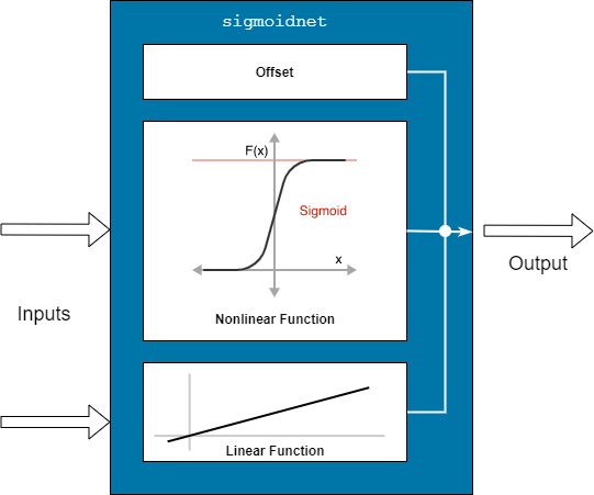A sigmoidnet объект реализует сигмоидную сетевую функцию и является нелинейной функцией отображения для оценки нелинейных моделей ARX и Hammerstein-Weiner. Функция отображения, которая также называется нелинейностью, использует комбинацию линейных весов, смещения и нелинейной функции для вычисления ее выходного сигнала. Нелинейная функция содержит сигмоидные единичные функции, которые работают на гребневой комбинации (взвешенная линейная сумма) входов.
