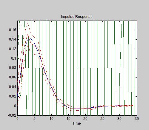 На графике видно, что импульсная характеристика нерегулируемой модели arx0500 находится далеко от истинной системы и имеет большие неопределенности.