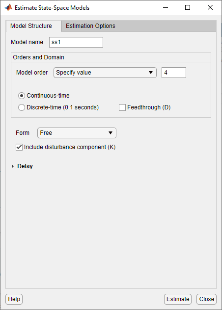 Выберите опцию Непрерывное время (Continuous-time) или Дискретное время (District-time), чтобы указать тип модели для оценки.