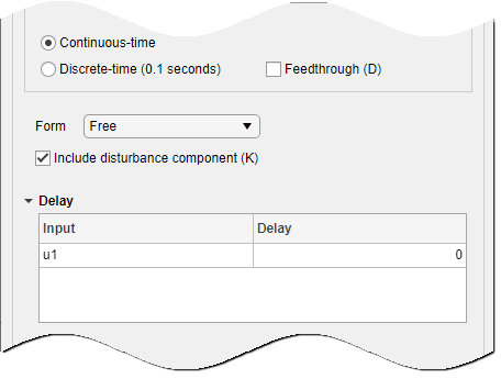 Укажите элементы, включаемые в структуру модели, включая сквозное соединение (матрица D) и компонент возмущения (матрица K.) Укажите форму модели, например каноническую форму, выбрав из параметров в разделе Форма. Чтобы указать задержки, разверните раздел Задержка.