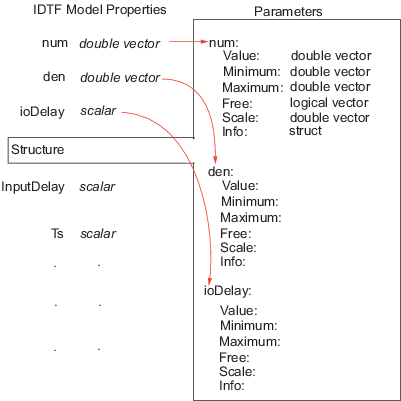 Для модели передаточной функции, Numerator, Denominator, и IODelay свойства модели являются просто указателями на Value атрибут соответствующего параметра в Structure собственность.