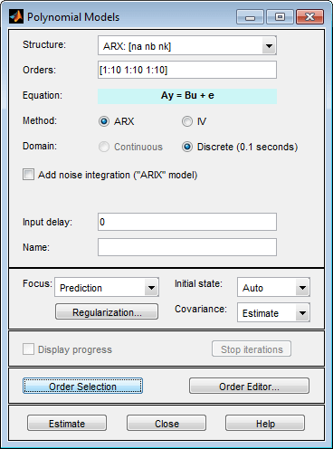 В большинстве случаев заранее не известны заказы модели. Чтобы получить начальные заказы моделей и задержки для системы, можно оценить несколько моделей ARX с диапазоном заказов и задержек и сравнить производительность этих моделей. Выбираются заказы модели, которые соответствуют наилучшей производительности модели, и эти заказы используются в качестве начального предположения для дальнейшего моделирования.