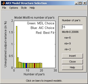 nn = selstruc(V,'AIC');где nn содержит соответствующее na, nb, и nk заказы.