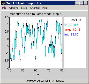 В этом уравнении y - измеренный выходной сигнал, ^ - моделируемый или прогнозируемый выходной сигнал модели, а - среднее значение y. 100% соответствует идеальной посадке, и 0% указывает на то, что посадка не лучше, чем предположение о том, что выходной сигнал является константой = y).