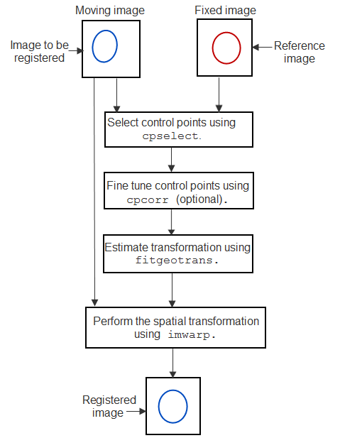 На следующем рисунке представлена графическая иллюстрация этого процесса. Дополнительный пример см. в разделе Регистрация изображений с искажением проекции с использованием контрольных точек.