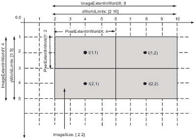 Image объекты (например, полученные при отображении изображения с помощью imshow) определить мировой экстент с помощью XData и YData свойства. Каждое свойство представляет собой двухэлементный вектор, задающий центральную координату самых внешних пикселов в этом измерении. Дополнительные сведения см. в разделе Свойства изображения.