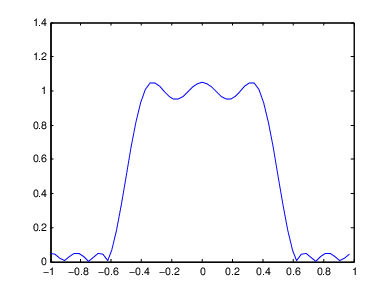Пространственную протяженность пульсаций можно уменьшить с помощью фильтра большего размера. Однако фильтр большего размера не уменьшает высоту пульсаций и требует большего времени вычисления для фильтрации. Чтобы получить более гладкую аппроксимацию желаемой частотной характеристики, рассмотрим использование способа преобразования частоты или способа оконной обработки.