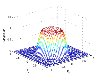 Hd = zeros(11,11); Hd(4:8,4:8) = 1; [f1,f2] = freqspace(11,'meshgrid'); mesh(f1,f2,Hd), axis([-1 1 -1 1 0 1.2]), colormap(jet(64)) h = fsamp2(Hd); figure, freqz2(h,[32 32]), axis([-1 1 -1 1 0 1.2])