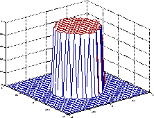 [f1,f2] = freqspace(25,'meshgrid'); Hd = zeros(25,25); d = sqrt(f1.^2 + f2.^2) < 0.5; Hd(d) = 1; mesh(f1,f2,Hd)