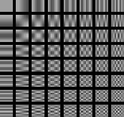 Эти функции называются базовыми функциями DCT. Тогда коэффициенты ДКП Bpq могут рассматриваться как веса, применяемые к каждой базисной функции. Для матриц 8 на 8 64 базисные функции иллюстрируются этим изображением.