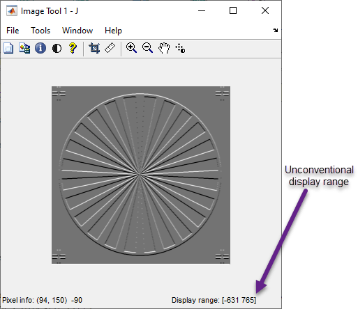 Следующий пример фильтрует изображение в градациях серого, создавая нетрадиционные данные диапазона. Пример вызовов imtool для отображения изображения в средстве просмотра изображений с помощью опции автоматического масштабирования. При выполнении этого примера обратите внимание на диапазон отображения, указанный в правом нижнем углу окна «Просмотр изображений».