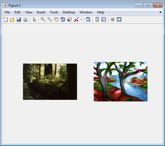 [X1,map1]=imread('forest.tif'); [X2,map2]=imread('trees.tif'); subplot(1,2,1), imshow(X1,map1) subplot(1,2,2), imshow(X2,map2)