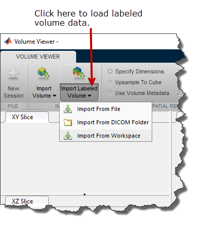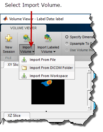 Если помеченный объем уже находится в средстве просмотра объемов, загрузите объем интенсивности в приложение. Щелкните Импорт объема (Import Volume) и выберите параметр Импорт из рабочей области (Import From Workspace).