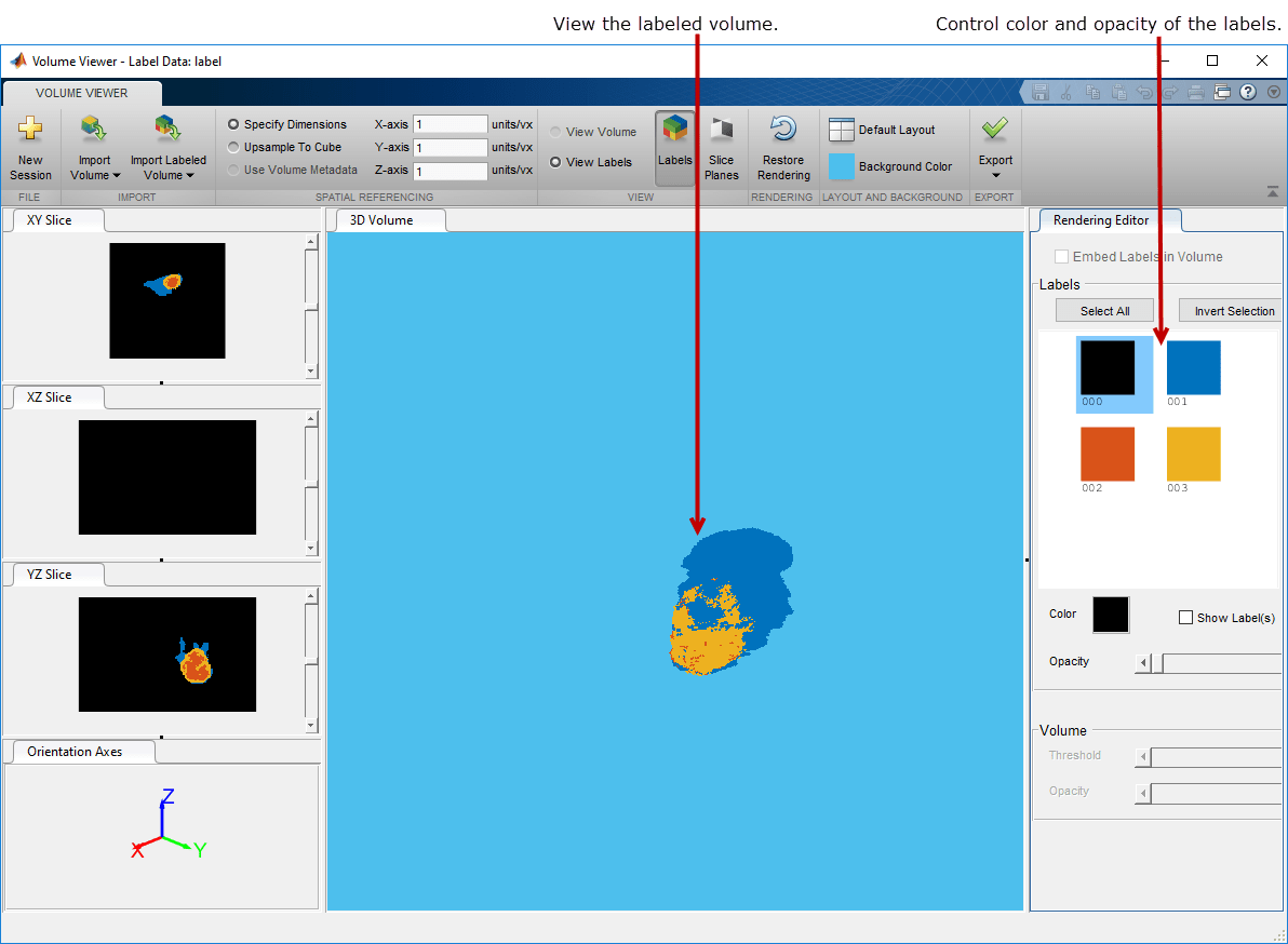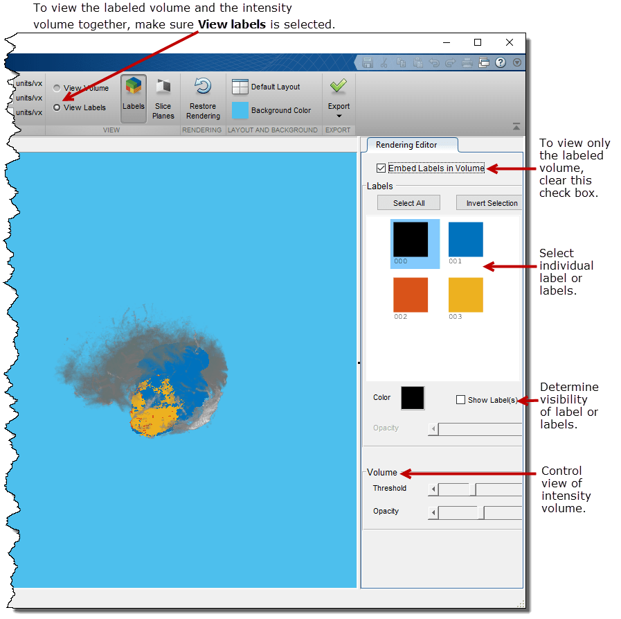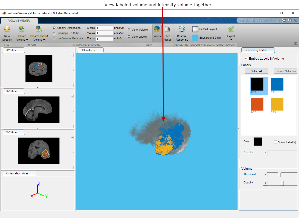 В этой части примера показано, как загрузить помеченный объем и объем интенсивности в Volume Viewer.
