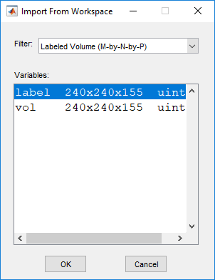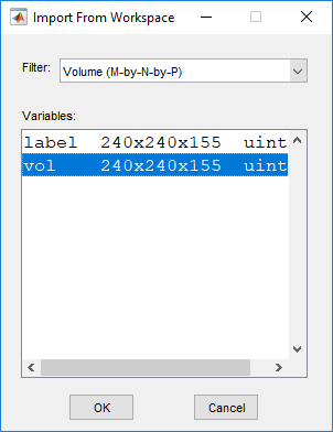 Выберите переменную рабочей области, связанную с помеченными данными объема, в диалоговом окне Импорт из рабочей области (Import from Workspace) и нажмите кнопку ОК.
