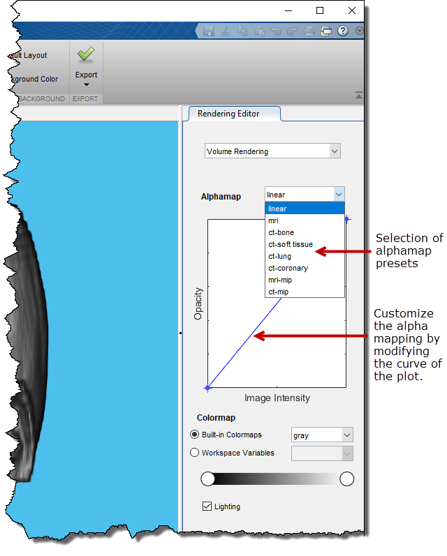Визуализация объема сильно зависит от определения соответствующей альфа-карты, так что структуры, которые требуется видеть, непрозрачны, а структуры, которые не требуется видеть, прозрачны. Редактор тонирования позволяет определить непрозрачность и прозрачность значений вокселя по всему объему. Можно выбрать набор наборов параметров alphamap, которые автоматически обеспечивают определенные определенные эффекты. Например, чтобы определить представление, которое хорошо работает с данными кости КТ, выберите предустановку визуализации кости КТ. По умолчанию средство просмотра объемов использует простую линейную зависимость, но каждый предустановленный параметр изменяет кривую графика, придавая определенному значению данных большую или меньшую непрозрачность. Можно настроить альфа-карту, непосредственно манипулируя графиком.