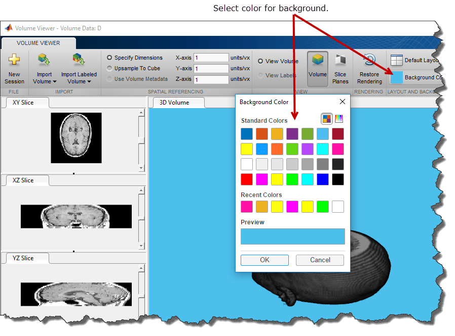 Чтобы изменить цвет фона, используемый в окне отображения, щелкните Цвет фона (Background Color) и выберите цвет.