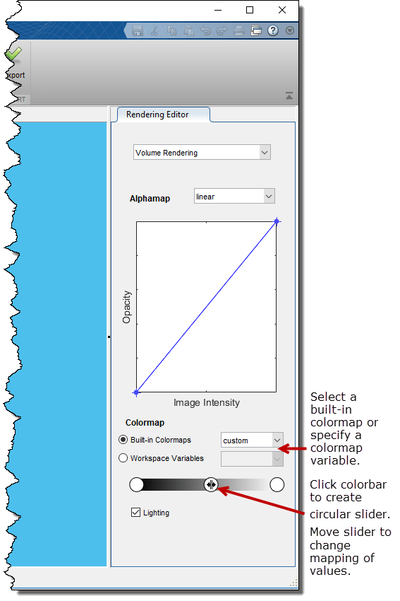 Цвет, при использовании с интенсивностью вокселя и непрозрачностью, является важным элементом визуализации объёма. В редакторе тонирования можно выбрать из списка предопределенных карт цветов MATLAB, например: jet и parula. Можно также указать пользовательскую цветовую карту, определенную как переменная в рабочем пространстве. Можно также изменить сопоставление цветов для любой карты цветов с помощью интерактивной шкалы цветовых полос. Например, чтобы осветить значения цвета в визуализации, щелкните панель цветов, чтобы создать круговой ползунок. Чтобы изменить сопоставление цветов так, чтобы большее количество значений соответствовало более светлым цветам, переместите ползунок влево. На панели цветов можно создать несколько ползунков для определения других цветовых сопоставлений.